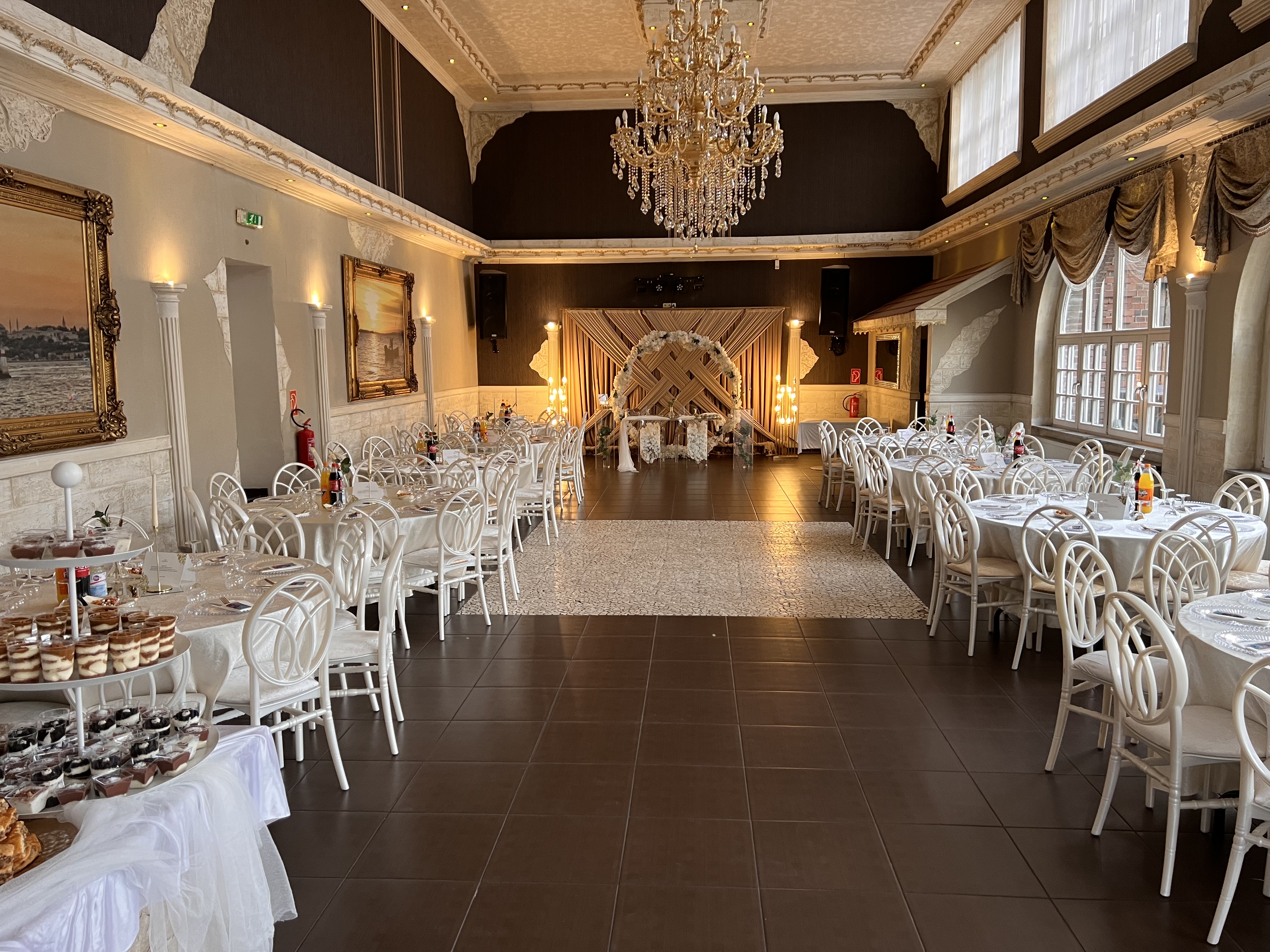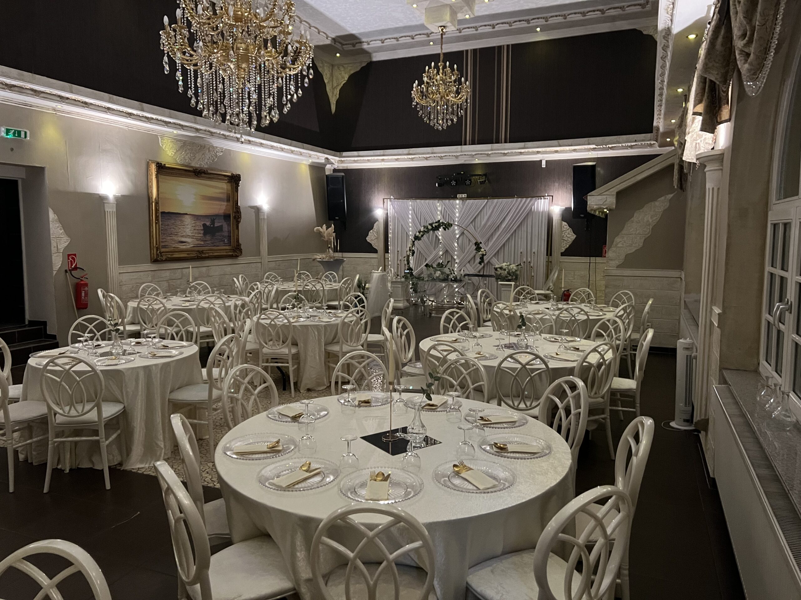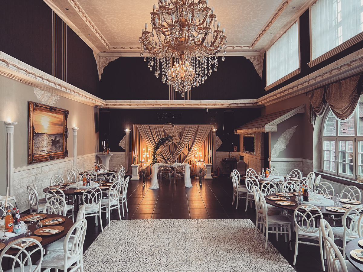 Alkoholfreie Event-Location, Eingang über die große Terrasse durch den festlich beleuchteten Pavillon. Reichlich Parkmöglichkeiten, Gebetshütte, großzügiger Gastraum, in dem bis zu 120 Personen Platz finden. Aktuellste Hochzeitsbestuhlung und runde Tische, große und helle Kronleuchter, hohe Decken, Barock-Style, verschiedene Dekormöglichkeiten.