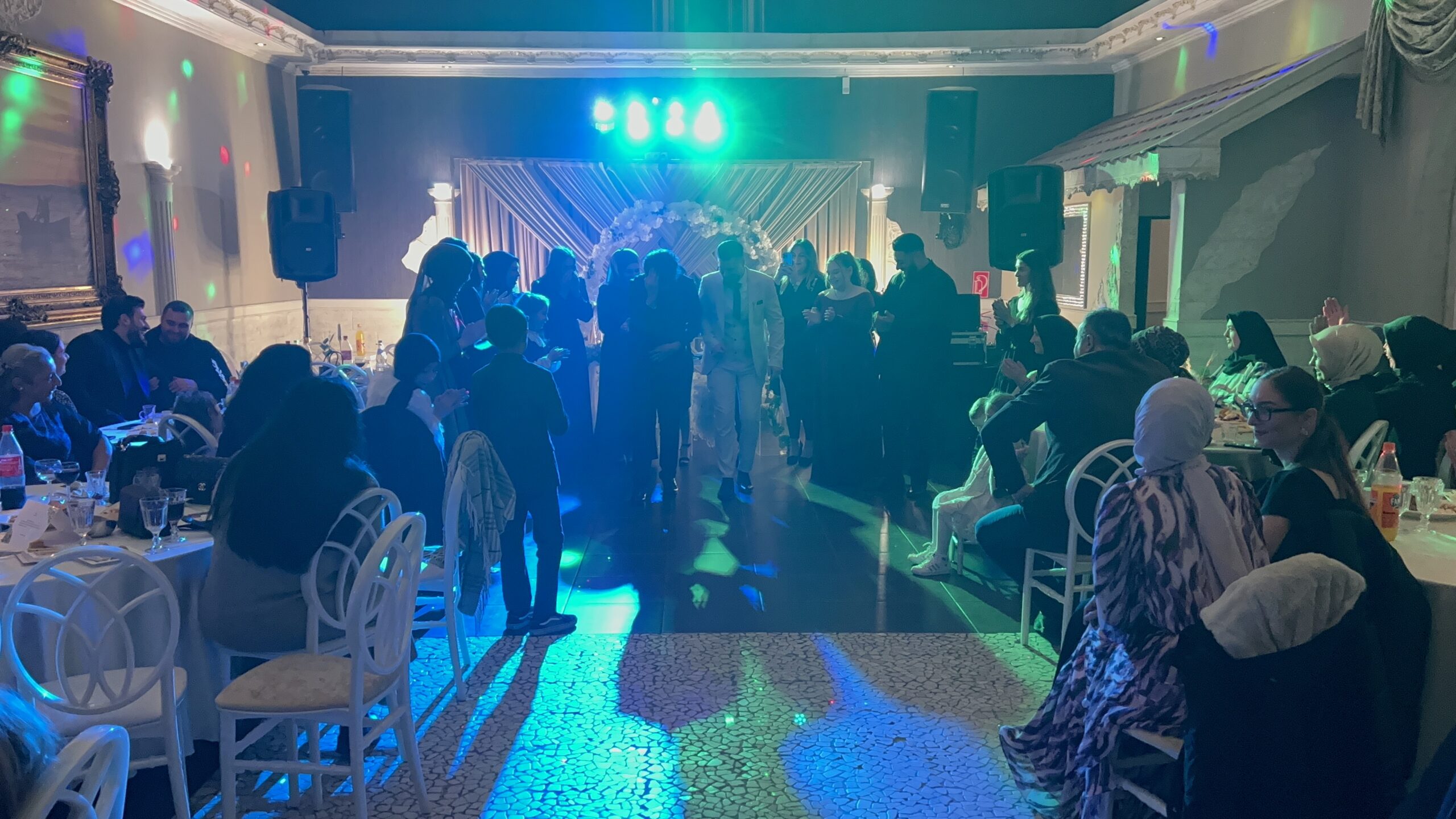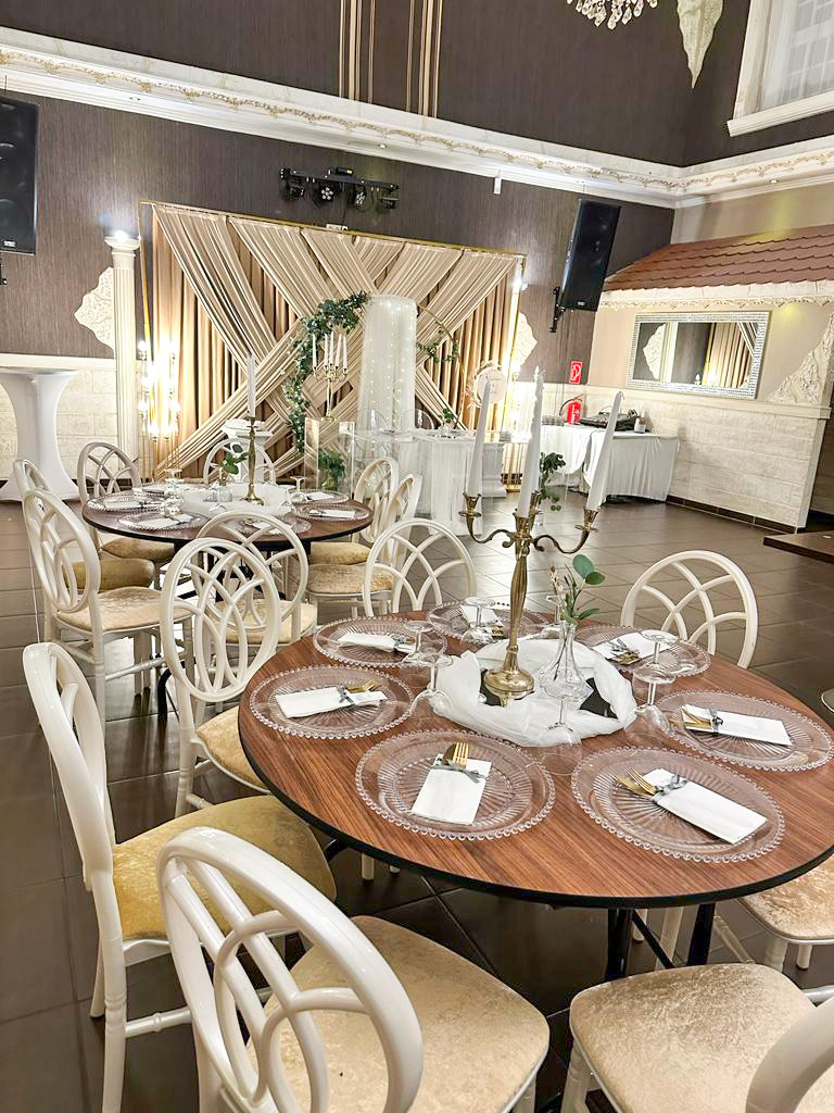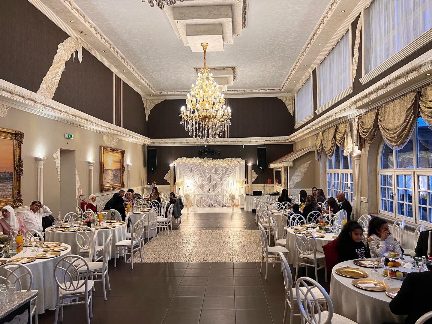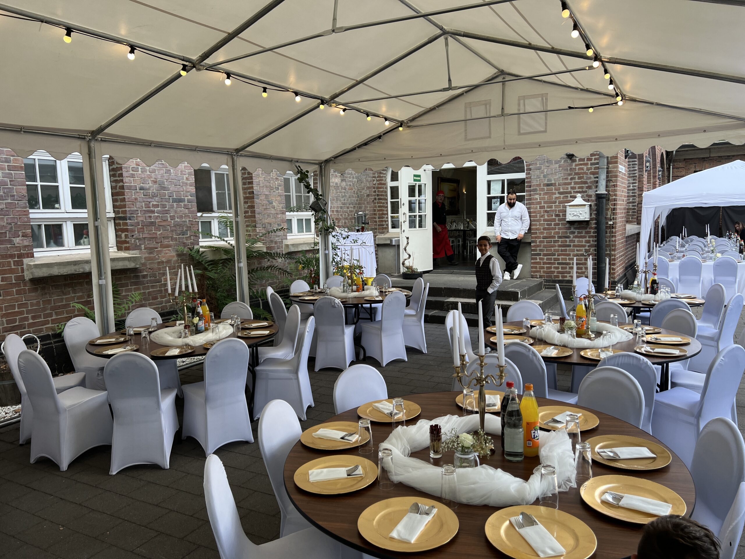 Alkoholfreie Event-Location, Eingang über die große Terrasse durch den festlich beleuchteten Pavillon. Reichlich Parkmöglichkeiten, Gebetshütte, großzügiger Gastraum, in dem bis zu 120 Personen Platz finden. Aktuellste Hochzeitsbestuhlung und runde Tische, große und helle Kronleuchter, hohe Decken, Barock-Style, verschiedene Dekormöglichkeiten.